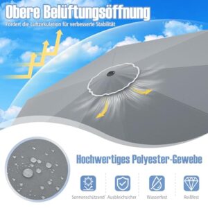 - 【Stabile & zuverlässige Struktur】Mit 8 robusten Metallrippen gebaut, gesichert mit einem Sicherheitsverschluss, bietet der Sonnenschirm verbesserte Stabilität und Windbeständigkeit gegen die Elemente. Oben befindet sich ein Luftventil, das zur Aufrechterhaltung der Luftzirkulation und zur Verringerung des Winddrucks dient. Hinweis: Ein beschwerter Sockel (nicht im Lieferumfang enthalten) ist für optimale Stabilität und Sicherheit erforderlich.