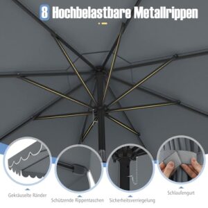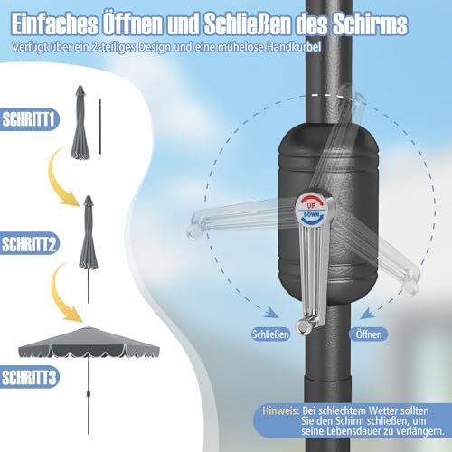 - 【Kurbelgriff für einfache Einrichtung】Dieser 3 m Terrassenschirm ist mit einem praktischen Kurbelgriff ausgestattet, der das Öffnen und Schließen des Schirms mühelos und problemlos macht. Und wenn er nicht in Gebrauch ist, kann der Schirm in 2 Abschnitte zerlegt werden, um Platz zu sparen.