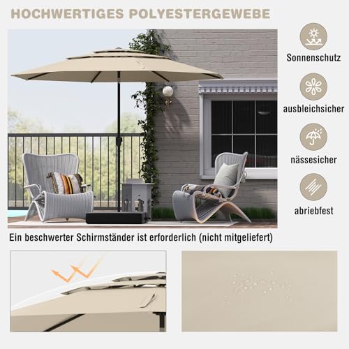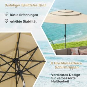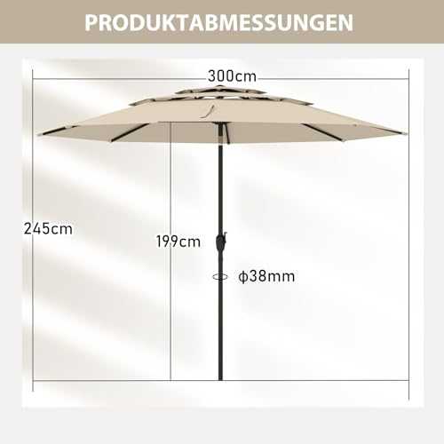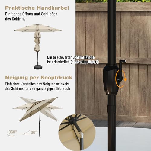 - 【3-schichtiges, belüftetes Design】Dank des 3-stufigen, belüfteten Dachs bietet der Terrassenschirm eine erhöhte Luftzirkulation zum Entspannen an heißen Sommertagen. Insgesamt trägt dieses Design dazu bei, den Winddruck auf den Schirm zu reduzieren und das Risiko zu minimieren, dass er von Böen umgeworfen wird.