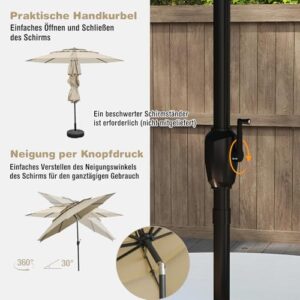 - 【Neigesystem und Kurbelgriff】Der Sonnenschirm verfügt über einen leicht zu bedienenden Kurbelgriff, der ein nahtloses Öffnen und Schließen gewährleistet. Übrigens können Sie den Schirm mit dem Kippmechanismus per Druckknopf je nach Sonnenstand anpassen, um optimalen Schatten zu spenden.