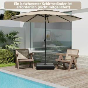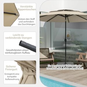 - 【Hochwertiges Dach】Der Sonnenschirm ist mit einem Polyesterdach ausgestattet, das nicht ausbleicht und eine lange Lebensdauer garantiert. Zusätzlich schützt Sie das Dach vor grellem Sonnenlicht oder leichtem Regen und ist damit die perfekte Wahl für ein Treffen im Garten oder zum Entspannen am Pool.