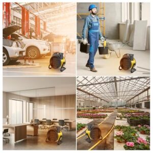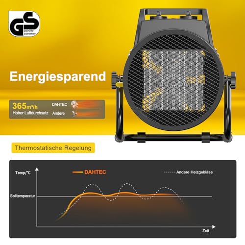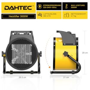 - Vielseitige Anwendungsmöglichkeiten:Der DAHTEC elektrische Heizlüfter ist die ideale Wahl für mobilen Wärmebedarf und perfekt geeignet für kleine Räume wie Wohnungen, Büros, Werkstätten, Lagerhallen, Garagen, Baustellen, Gewächshäuser und mehr