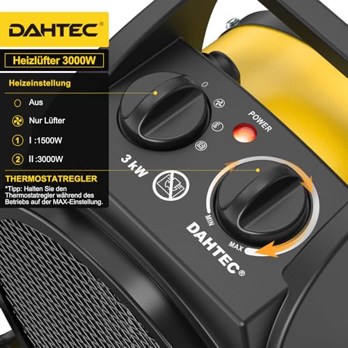 - Mehrfache Sicherheitsfunktionen:Der DAHTEC Heizlüfter aus Stahl verfügt über mehrere Sicherheitsfunktionen wie Thermostat, Überhitzungsschutz und ein stabiles 1,60 m langes Stromkabel. Sicherer und sorgenfreier Dauerbetrieb