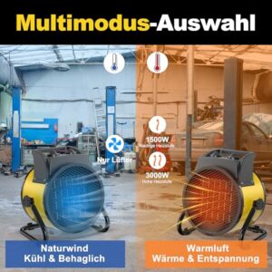 - Ausgefallene Design-Details:3 Einstellungen: 25W (nur Lüfter), 1500W & 3000W. Dieser tragbare Heizer wiegt nur 2,7 kg für einfachen Transport und hat einen 0°-30° verstellbaren Fuß zur individuellen Winkelanpassung