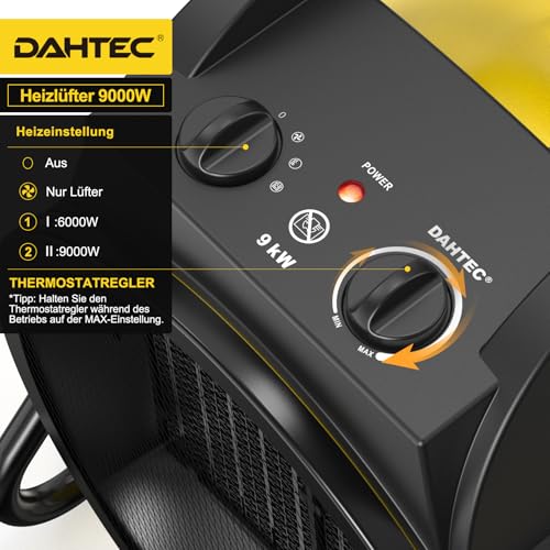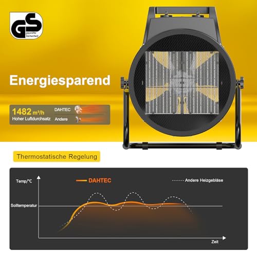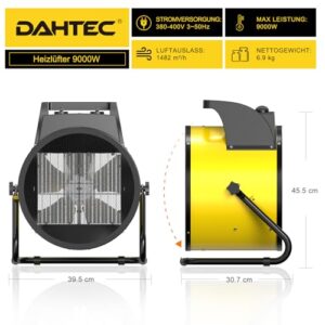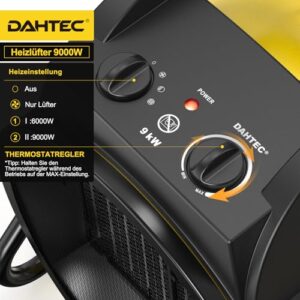 - Vielseitige Anwendungsmöglichkeiten:Der DAHTEC elektrische Heizlüfter ist die ideale Wahl für größeren, mobilen Wärmebedarf und perfekt geeignet für große Räume wie Werkstätten, Lagerhallen, Garagen, Baustellen, Gewächshäuser, Gärten, Geschäfte und mehr