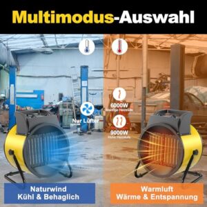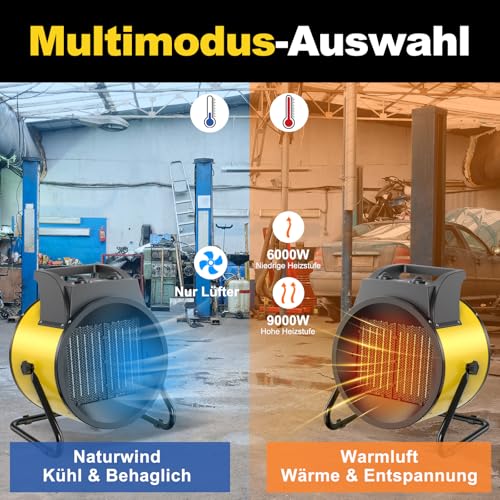 - Ausgefallene Design-Details:3 Einstellungen: 80W (nur Lüfter), 6000W & 9000W. Dieser tragbare Heizer wiegt nur 6,9 kg für einfachen Transport und hat einen 0°-30° verstellbaren Fuß zur individuellen Winkelanpassung