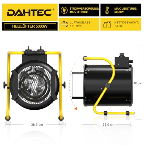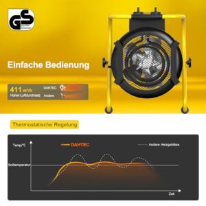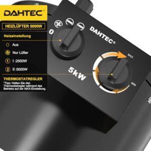 - Effiziente Heizleistung:Der DAHTEC Industrie-Heizlüfter kombiniert einen Hochleistungsmotor mit Edelstahl-Heizelementen für schnelle Erwärmung, stärkeren Luftstrom mit größerer Reichweite und höhere Energieeffizienz
