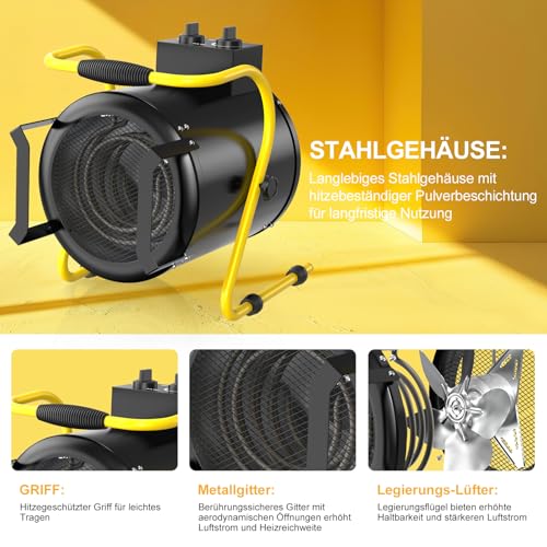 - Design-Details:3 Stufen: 30W (nur Lüfter), 2500W & 5000W. Der praktische Tragegriff ermöglicht einfachen Transport. Rutschfeste Kunststofffüße gewährleisten sicheren Stand auch auf unebenen Flächen