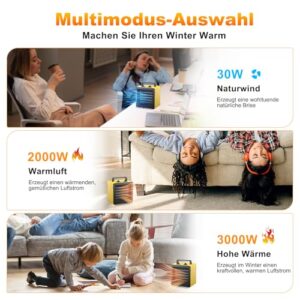 - 3 Betriebsmodi:30W (nur Lüfter), 2000W & 3000W. Ganzjahres-Komfort durch Lüftermodus