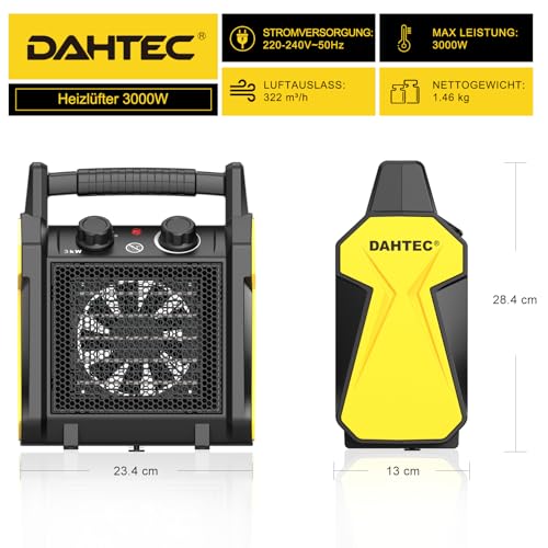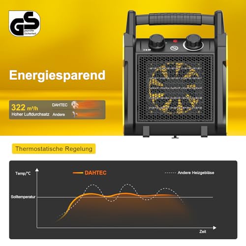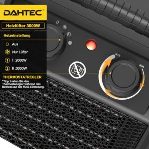 - Mehrfache Sicherheitsfunktionen:Der DAHTEC Heizlüfter verfügt über Thermostat, Überhitzungs- und Kippschutz sowie ein robustes 1,60 m langes Stromkabel. Sicherer Dauerbetrieb rund um die Uhr