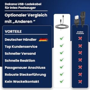 - DEUTSCHER HÄNDLER – EINFACHER ERSATZ BEI KABELVERLUST: Als deutscher Anbieter bietet Dakana dir schnellen Versand, kompetenten Support und zuverlässige Qualität. Dieses USB-Kabel ist ideal als Ersatzlösung, wenn das Original verloren ging oder beschädigt wurde. Die einfache Handhabung, hohe Kompatibilität und schnelle Verfügbarkeit machen es zur perfekten Wahl für alle Intex-Poolsauger-Besitzer. Jetzt bestellen und den Sommer entspannt genießen.