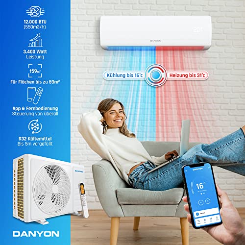 - 5-in1 FUNKTION: Die leistungsstarke Split Klimaanlage 12000 BTU / 3,4 kW bietet Kühlen, Heizen, Entfeuchten, Ventilator und Luftreinigung. Ideal für Räume bis 59m². Blitzschnelles Kühlen auf bis zu 16°C und eine leistungsstarke Heizfunktion bis 31°C