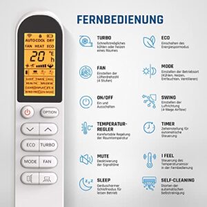 - LEISER KOMFORT: Perfektes Raumklima mit unserer leisen Splitanlage mit I-Feel-Funktion. Gleichmäßige Verteilung durch 4-Wege Luftstrom, schnelle Kühlung durch 4 Turbo-Lüfterstufen. Ruhige Nächte mit dem Schlafmodus (ab 19dB) und dabei Energie sparen.