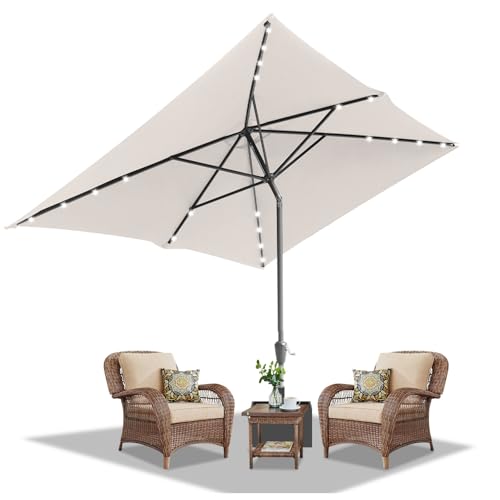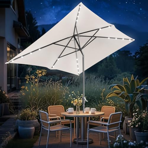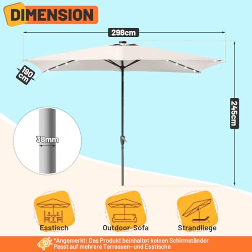 - 【SOLAR SONNENSCHIRM MIT LED】 Weiße LED-Leuchten, die von leistungsstarken Solarzellen betrieben werden. 16LED-Leuchten sorgen für ein angenehmes Ambiente. Genießen Sie schöne Sommerabende unter der LED-Beleuchtung. Durch den dezenten An-/Aus- Druckknopfschalter, lässt sich das Licht spielendeinfach steuern.