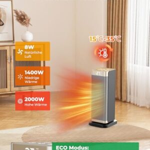 - 【Fernbedienung mit Smart-Features】Wärme auf Knopfdruck. Steuern Sie alle Funktionen bequem vom Sofa aus: 12h Timer für automatisches Abschalten/Oszillationsfunktion für 70°/Einstellbare Temperatur, benutzerdefinierte Temperatureinstellungen, ECO-Konstanttemperatur-Energiesparmodus/Drei Leistungsstufen (8W/1400W/2000W). So intuitiv wie Ihr Smartphone – aber für Wärme!