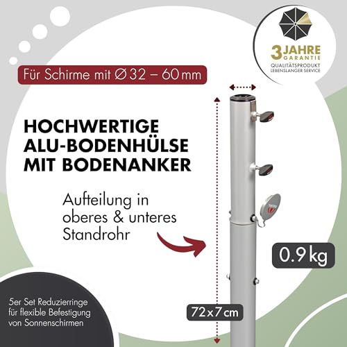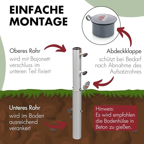 - FESTER HALT - Die hochwertige Aluminium-Hülse wurde für eine dauerhafte Nutzung entwickelt. Es wird empfohlen, die Bodenhülse in Beton zu gießen (mind. 40x40 cm groß, 60 cm tief)