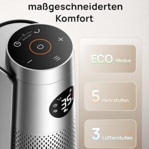 - 𝙁𝙡𝙚𝙭𝙞𝙗𝙡𝙚 𝙒ä𝙧𝙢𝙚𝙧𝙚𝙜𝙪𝙡𝙞𝙚𝙧𝙪𝙣𝙜: Dieser elektrische Heizlüfter bietet 9 Komfortstufen für Ihre individuellen Bedürfnisse. Wählen Sie aus 5 Heizstufen und dem ECO-Modus für optimale Wärme oder nutzen Sie 3 Ventilatorstufen zur Luftzirkulation.