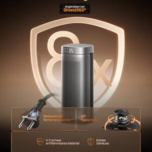 - 𝐔𝐧ü𝐛𝐞𝐫𝐭𝐫𝐨𝐟𝐟𝐞𝐧𝐞 𝐒𝐢𝐜𝐡𝐞𝐫𝐡𝐞𝐢𝐭 𝐮𝐧𝐝 𝐙𝐮𝐯𝐞𝐫𝐥ä𝐬𝐬𝐢𝐠𝐤𝐞𝐢𝐭: Genießen Sie höchste Sicherheit mit diesem Innenheizgerät, das über einen Shield360°-Schutz, Kippschutz und Überhitzungsschutz, eine 24-Stunden-Auto-Ausschaltfunktion und V-0 flammhemmende Materialien verfügt. CE-gelistet für Ihr beruhigtes Gewissen