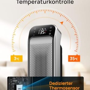 - Präzise Temperaturregelung: Stellen Sie die Raumtemperatur so genau wie nie zuvor ein. Dieser Heizlüfter mit Thermostat verwendet einen speziellen Temperatursensor, um die Raumtemperatur zu messen und die Heizung automatisch im ECO-Modus anzupassen. Die Temperatur kann zwischen 5 und 35 °C (41-95 °F) mit einer Genauigkeit von 1 °F eingestellt werden, um optimalen Komfort zu gewährleisten.