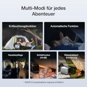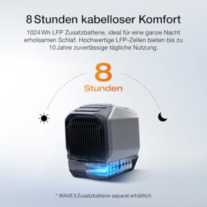 - Kabellose Freiheit überall: Die EcoFlow WAVE 3 Klimaanlage mit 1 024 Wh LFP-Batterie bietet bis zu 8 Std. kabellosen Betrieb. Dank 1 000 W Schnellladung in nur 75 Min. über Wechselstrom, Lichtmaschine, Auto oder Solar ist sie ideal für Camper und Vans. Die App ermöglicht eine komfortable Überwachung in Echtzeit. (WAVE 3 Zusatzbatterie separat erhältlich)