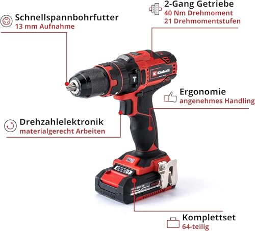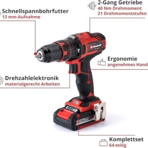 - Kraftvoll - Das leistungsstarke Zwei-Gang-Getriebe des Akku-Schlagbohrschraubers ermöglicht kraftvolles Bohren und Schrauben mit 40 Nm Drehmoment und 21 Drehmomentstufen.