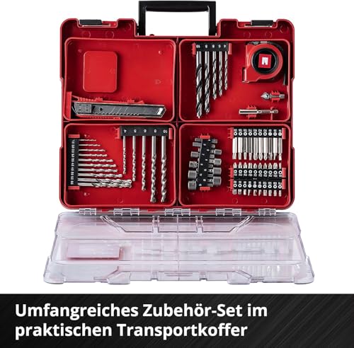 - Umfangreiches Zubehör - Der Akku-Schlagbohrschrauber TE-CD 18/40 Li-i +64 (2x2,0Ah) wird mit zwei 2,0Ah Power X-Change Akkus, einem Ladegerät, einem Koffer und einem 64-teiligen Zubehör-Set geliefert.