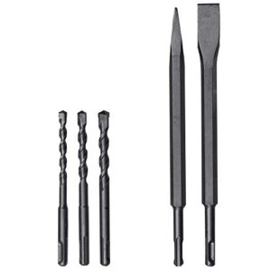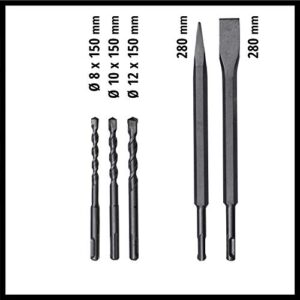 - Die Lieferung inklusive drei Bohrern (Ø 8, 10, 12 mm) sowie Spitz- und Flachmeißel erfolgt im praktischen Transport- und Aufbewahrungskoffer E-Box.