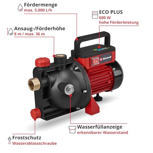 - Gartenpumpe – Die Einhell Gartenpumpe GC-GP 6050 ECO PLUS hat eine Leistung von 600 Watt und eignet sich bestens, um Brunnen oder Regentonnen zur Gartenbewässerung zu nutzen.