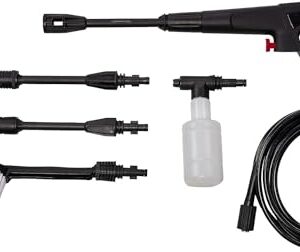 - Im Lieferumfang inklusive ist ein 5 m langer Hochdruckschlauch, eine Pistole, eine Lanze, eine rotierende Düse sowie eine Punkt- und Breitstrahldüse, eine Bürste und ein Sprühmittelbehälter.
