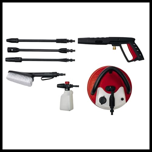 - Im Lieferumfang inklusive ist ein 10 m langer Hochdruckschlauch, eine Pistole, eine Lanze, eine rotierende Düse sowie eine Punkt- und Breitstrahldüse, eine Bürste, ein Sprühmittelbehälter sowie ein Terassenreiniger.