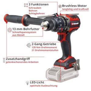 - Lieferung ohne Akku – Der Einhell Professional Akku-Schlagbohrschrauber TP-CD 18/120 Li-i BL-Solo wird ohne Power X-Change Akku und Ladegerät geliefert. Diese sind separat erhältlich.