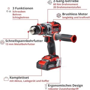 - Mit zwei-Gang-Getriebe zum kraftvollen Schrauben und schnellem Bohren. Mit starker Schlagbohrfunktion. Mit hochwertigem 13 Millimeter Metallbohrfutter.