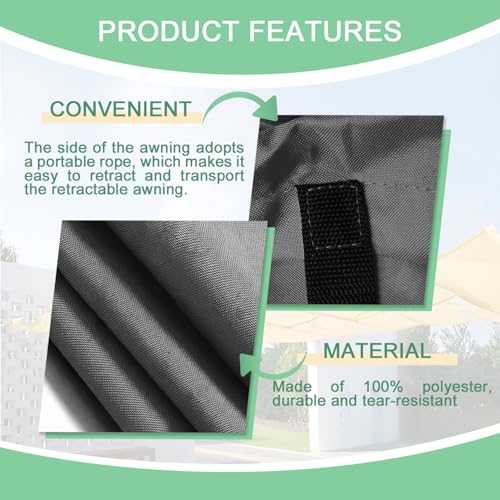 - 【Ausgezeichnetes Material】 Die Markise besteht aus Polyestergewebe mit einem Gewicht von 200Gramm pro Quadratmeter, das 95 % der ultravioletten Strahlen blockiert. Sie zeichnet sich durch exquisite Verarbeitung, Langlebigkeit und Widerstandsfähigkeit aus, wodurch eine komfortable Außenumgebung und Sicherheit gewährleistet werden.
