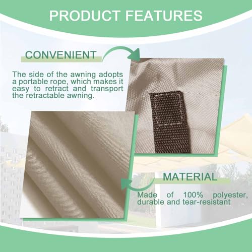 - 【Ausgezeichnetes Material】 Die Markise besteht aus Polyestergewebe mit einem Gewicht von 200Gramm pro Quadratmeter, das 95 % der ultravioletten Strahlen blockiert. Sie zeichnet sich durch exquisite Verarbeitung, Langlebigkeit und Widerstandsfähigkeit aus, wodurch eine komfortable Außenumgebung und Sicherheit gewährleistet werden.