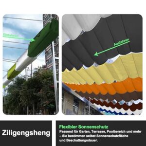 - 【Hochwirksamer Sonnenschutz】einziehbar Sonnensegel blockiert 95% der schädlichen UV-Strahlen (UPF50+ zertifiziert) und filtert 90% des Sonnenlichts. Es schafft schnell ein angenehmes Mikroklima in Gärten, auf Terrassen etc., sodass Sie unbesorgt die kühle Outdoor-Zeit genießen können.