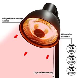 - Elektrischer Terrassenheizstrahler mit Halogenheiztechnologie liefert dreistufige Temperatureinstellung von 800 W, 1200 W oder 2000 W.