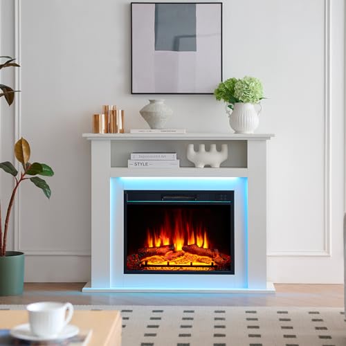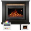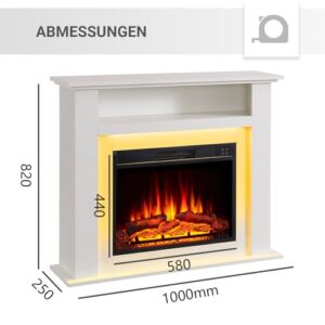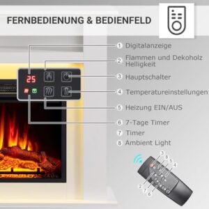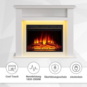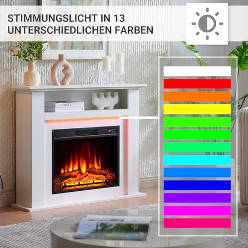 Elektrokamin BALDERIA Liora – Elektrischer Standkamin mit Ablagefach, 3D-Flammeneffekt, LED-Ambientebeleuchtung, Heizung 2000W, Timer, Thermostat, Fernbedienung – Weiß