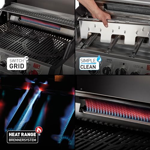 - SWITCH GRID: massiver, emaillierter Gussrost (dreigeteilt) mit herausnehmbarem Rundelement & 4 stufenlos regulierbare Edelstahlbrenner 3 x 3,5 kW + 1 x 4,2 kW (800 °C TURBO ZONE (4,2 kW))