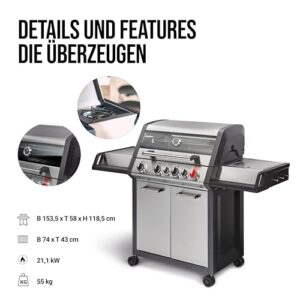 - Edelstahl-Brennkammer mit Aluguss-Seitenteile und doppelwandige Garhaube mit hochwertigen Aluguss-Endkappen sorgen für ein langlebiges Grillvergnügen