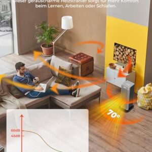 - Geräuscharmer Betrieb & Weitwinkel-Heizung – Dieser tragbare Heizlüfter rotiert um 70° und verteilt die warme Luft gleichmäßig im Raum, um Hitzestau zu vermeiden und dauerhaften Komfort zu gewährleisten. Dank des leisen Heizlüfters stört er weder Schlaf noch Arbeit oder Lesen. Eine ausgezeichnete Wahl an Heizgeräten für Zuhause, ideal für Schlafzimmer, Wohnzimmer, Homeoffice oder Arbeitszimmer.