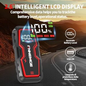 - 🚗【HD LCD-DISPLAY】Im Gegensatz zu herkömmlichen tragbaren Starthilfen, die lediglich über Anzeigeleuchten verfügen, bietet die FNNEMGE Auto-Starthilfe einen klar ablesbaren LCD-Bildschirm, der alle relevanten Informationen anzeigt. Der Betriebsstatus ist leicht verständlich und zeigt den Batteriestatus, Eingangs-/Ausgangsanzeigen sowie Warnungen bei hohen oder niedrigen Betriebstemperaturen an. So können Sie das Batterieladegerät rechtzeitig aufladen und verhindern, dass Ihnen während der Nutzung der Strom ausgeht.