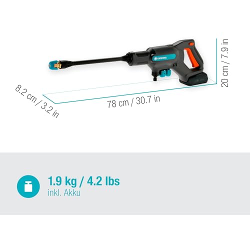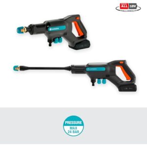 - Lieferumfang beinhaltet: 1x Gardena Akku Mitteldruckreiniger AquaClean 24/18V P4A solo, 1x 0°, 15° und 40° Düse, 1x lange und kurze Lanze, 1x OGS Anschluss für den Gartenschlauch, 1x 5 m Saugschlauch mit OGS Anschlüssen und Filter, je 1x Akkuschutzhülle klein und groß , Akku P4A PBA 18V/45 2.5 Ah, 1x Ladegerät