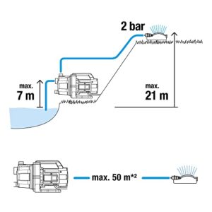 - Kompatibel: Durch den Druck von bis zu 4,1 bar lässt sich die Pumpe auch mit längeren Schläuchen oder Regnern wie dem Gardena AquaZoom (nicht enthalten) verwenden