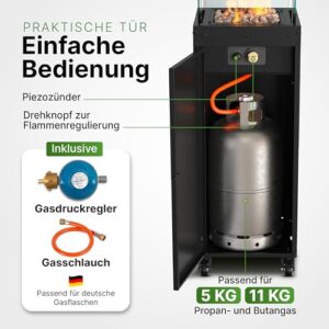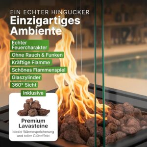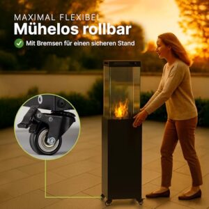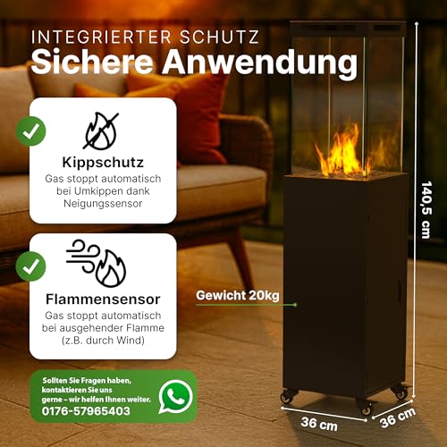 - Hochwertige Materialien – wetterfest, robust und wartungsfrei: Der Terrassenheizer Gas besteht aus langlebigem, pulverbeschichtetem Metall und hitzebeständigem Glas. Er ist wetterfest, rostgeschützt und für den ganzjährigen Einsatz im Außenbereich konzipiert. Ideal als Terrassenheizung Gas, Outdoor Gasheizer oder Feuersäule Terrasse – stilvoll und pflegeleicht zugleich.