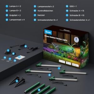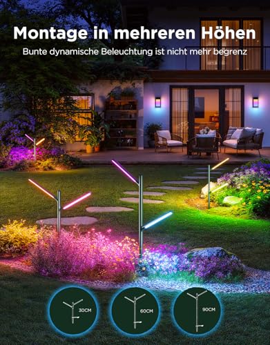 - DIY Mehrere Einbauhöhen: Die vier Lampenmasten der Govee Gartenleuchten lassen sich frei kombinieren, stellen Sie die Gartenlampe flexibel auf unterschiedliche Höhen (30-90cm) je nach Pflanzengröße ein, Downlighting von Sträuchern bis hin zu Töpfen ist problemlos möglich.