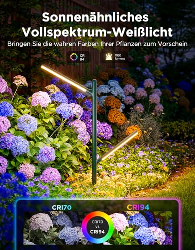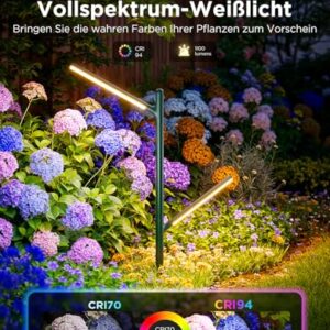 - Vollspektrum-Weißlicht 2700-6500K: Mit einem CRI 94 und einer Helligkeit von bis zu 1100lm simulieren die weißen Vollspektrum-Lichtperlen der Govee Outdoor Gartenleuchte das Sonnenlicht, um die wahren Farben der Pflanzen zu zeigen. Genießen Sie die Schönheit der Gartenpflanzen auch nachts.