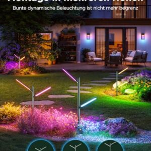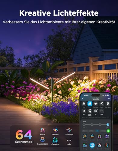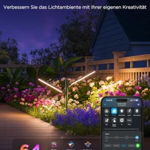 - Erkunden Sie Lichtszenen: Govee Outdoor Gartenleuchten können mit fünf Segmenten Farb- und Weißlicht gesteuert werden. Erleben Sie 64 voreingestellte Szenenmodi in der Govee Home App und gestalten Sie Ihren eigenen Farbmodus, um eine einzigartige Lichtatmosphäre für Ihren Garten zu schaffen.