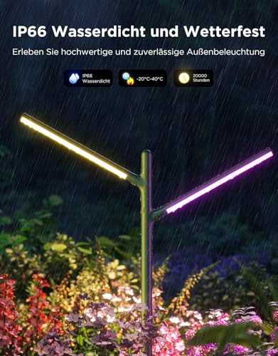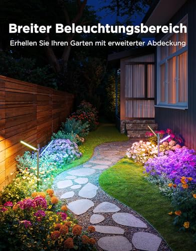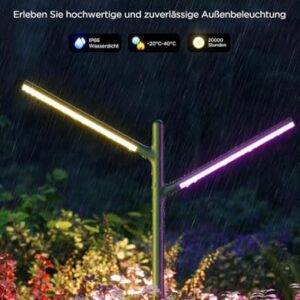 - Verbessertes RGBWWIC Technologie: Das von Govee selbst entwickelte 16-Bit-LuminBlend-Farbsteuerungssystem erzeugt 16 Millionen Farben mit verbesserter Präzision für Govee Outdoor Gartenleuchte, wodurch die Gartenbeleuchtung nicht mehr eintönig und langweilig ist.