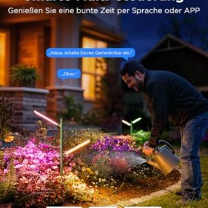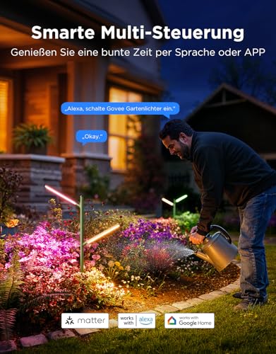 - Mühelose Smart Control: Steuern Sie Ihre Gartenbeleuchtung zusätzlich zur App über Sprachbefehle wie Alexa und Google Assistant. Verbinden Sie mit dem kompatibleren Matter Intelligentes Heimsystem wie Apple HomeKit, um ganz einfach eine dynamische Lichtshow für Ihren Garten zu erstellen.