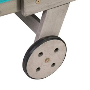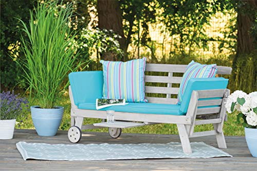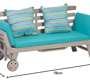 - Moderne Terrassenliege aus Akazienholz FSC 100% mit türkiser Auflage und mehrfarbig gestreiften Kissen aus 100 % Polyester – zwei Rollen dienen als Hilfe beim Verschieben der Multifunktionsliege